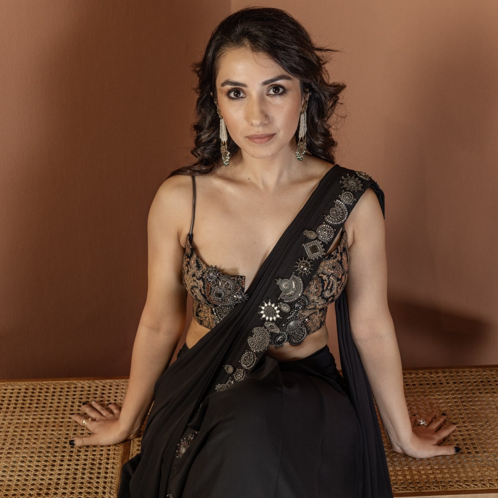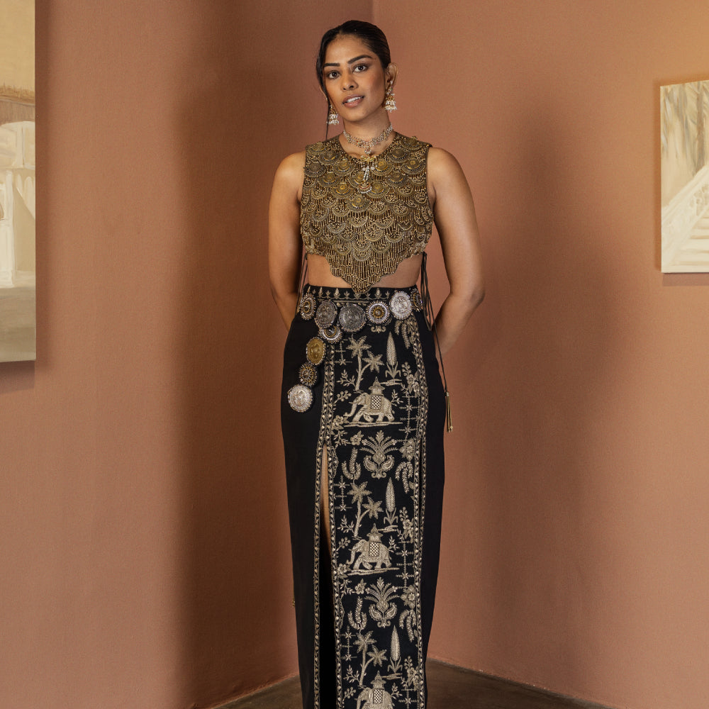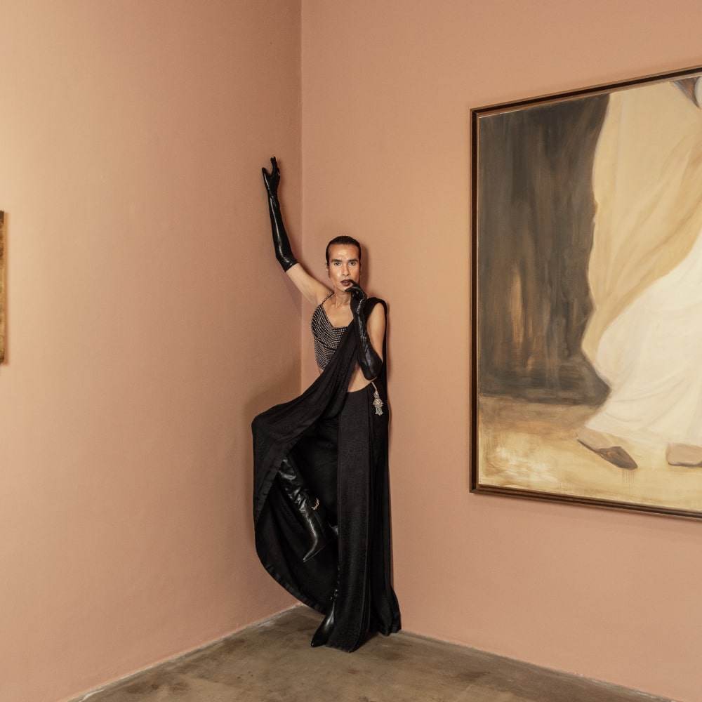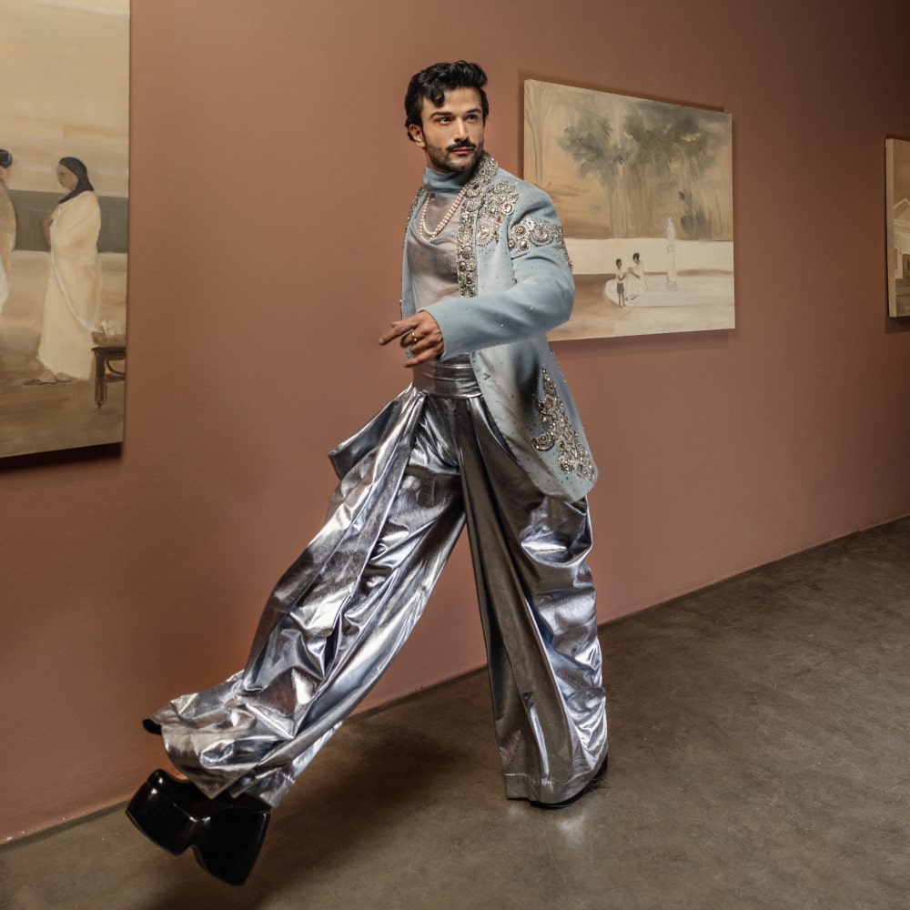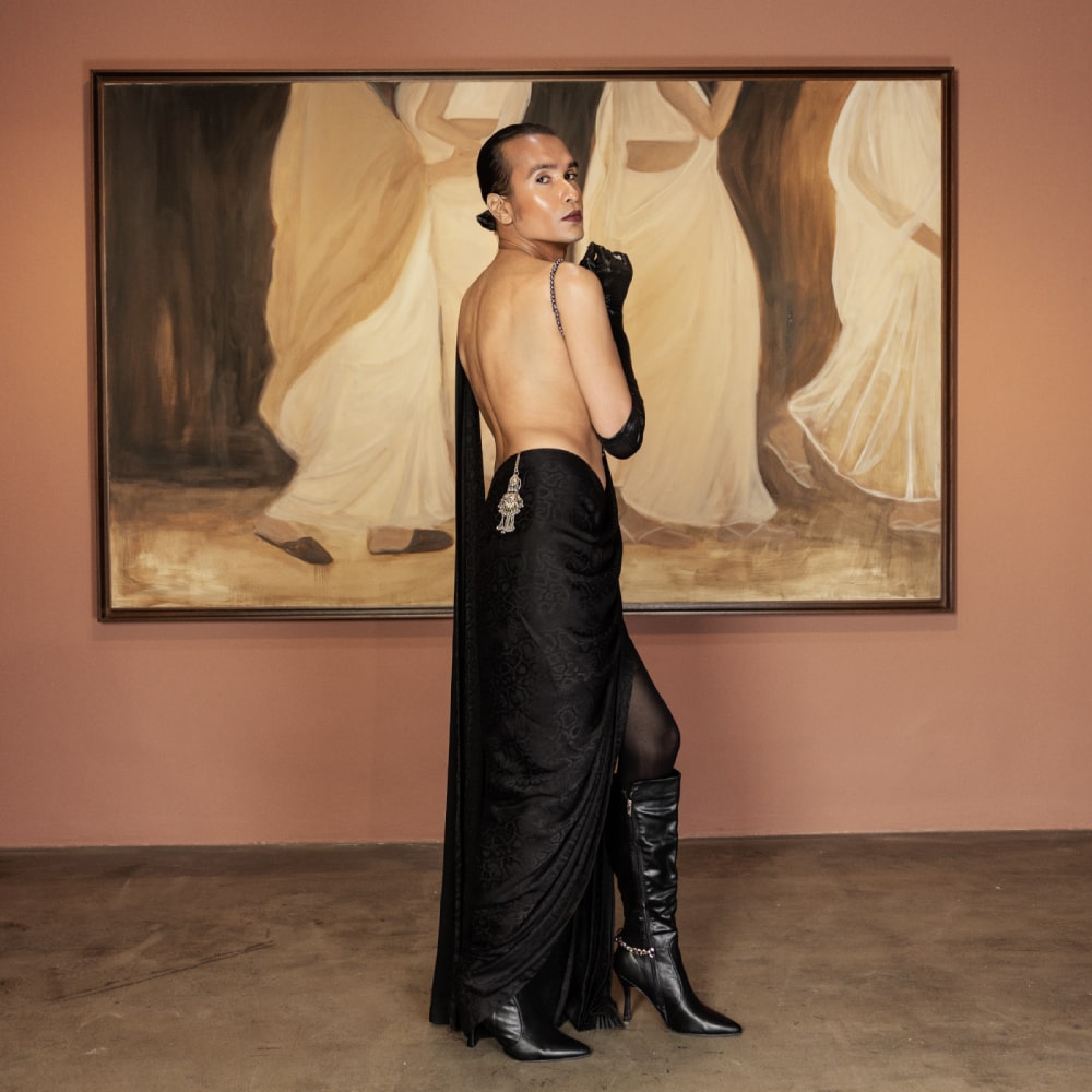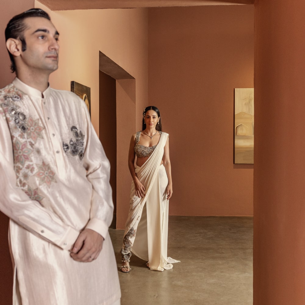 Fluidity meets structure, tradition converges with modernity, and nostalgia embraces the avant-garde in this collection of cocktail sarees and tuxedos.