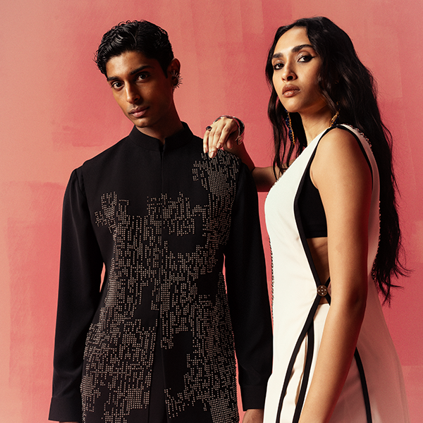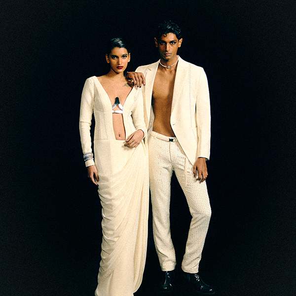 Fluidity meets structure, tradition converges with modernity, and nostalgia embraces the avant-garde in this collection of cocktail sarees and tuxedos.