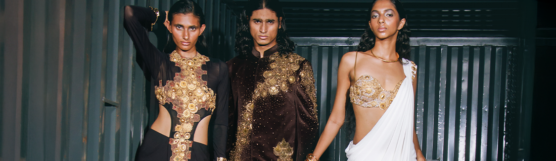 Fluidity meets structure, tradition converges with modernity, and nostalgia embraces the avant-garde in this collection of cocktail sarees and tuxedos.